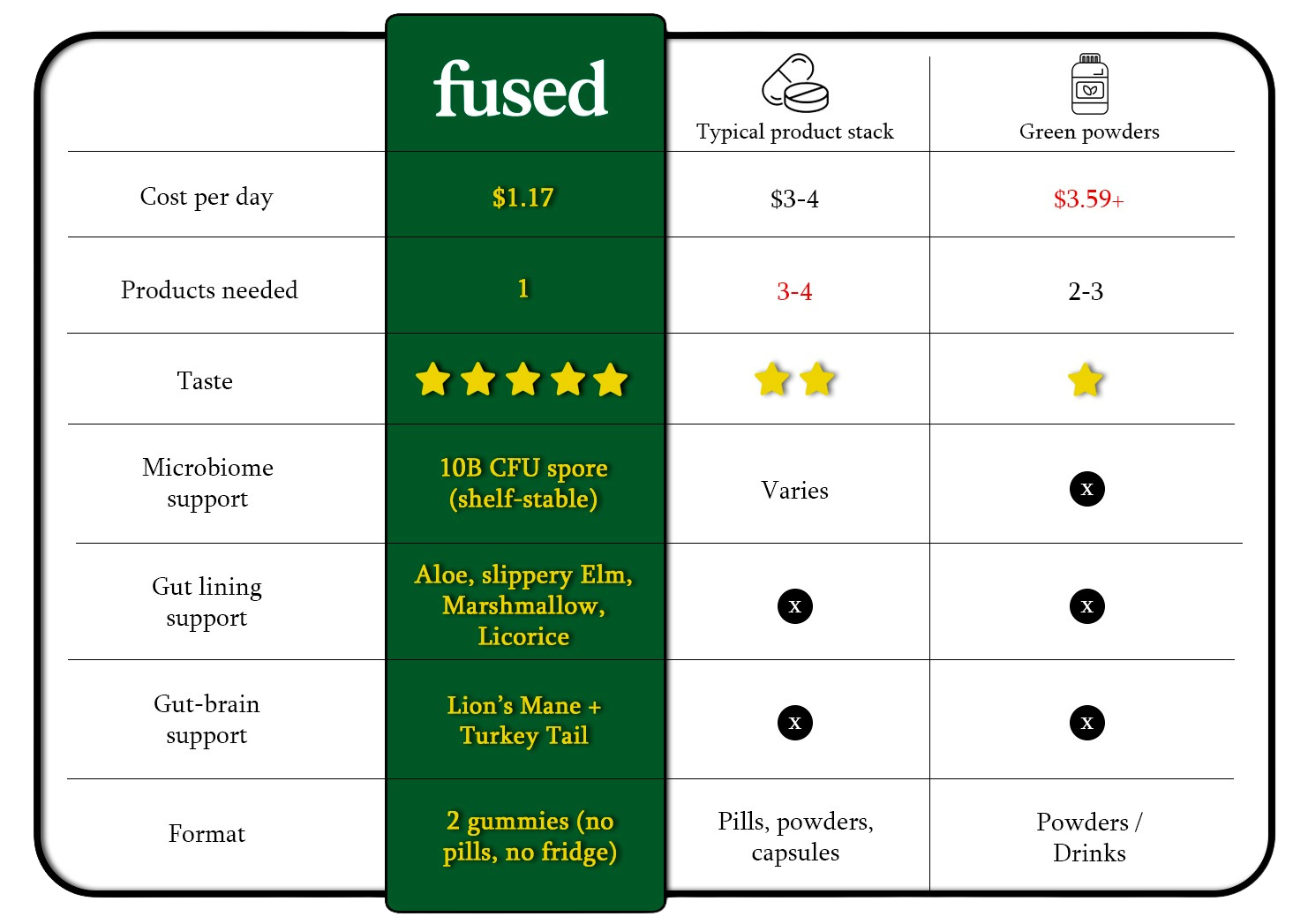 ✔ No pills, no fridge, no stacking supplements